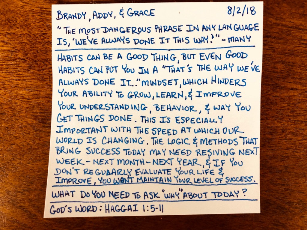 Habits can be a good thing, but even good habits can put you in a “This is that way we’ve always done it” mindset that hinders your ability to learn, grow, and improve your understanding, behavior, and way you get things done. This is especially important with the speed at which our world is changing. The logic and methods we use today might need revising next week – next month – next year, and if you’re stuck in a mindset that doesn’t allow for regular periods of evaluation and improvement, then you won’t be able to maintain your level of achievement.